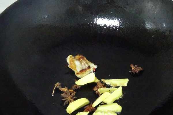 4.之後把炒鍋加熱,挑一塊帶有肥膘的鴨肉用小火煎出油脂後,再把薑片和八角入鍋爆出香味。