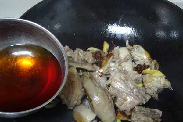 5.再把鴨肉入鍋不停的翻炒至鴨肉全部變色後再把黃酒倒入,不用黃酒可以用料酒。