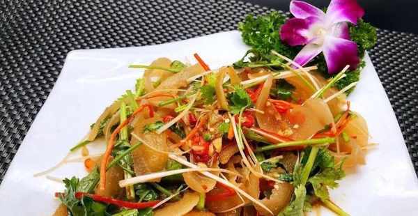 牛腳皮是廣東省江門市恩平的一道非常地道的特色小吃,主要是用牛腳上的肉繭制作的,需要經過反復的洗刷,再清燜而成,看著其實有點像豬皮凍,吃著爽口彈牙,還帶有淡淡的牛肉香味,屬於一道不上檔次的菜,但卻是恩平的一大特色。