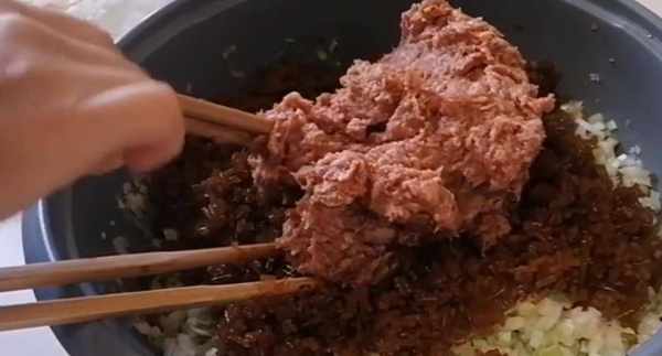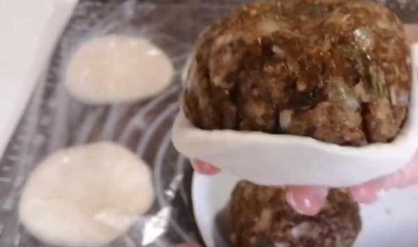 4、如果感覺餡料太多,不好包的話,也可以將它減少到300克左右。或者是將餡料放進冰箱裡面略微冷凍一下,要好包些。