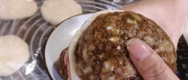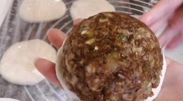 6、將餡料團放在面皮上,右手用虎口托著面皮的上邊,左手一邊配合,一邊用大拇指把餡料往下壓。包餡料的過程一定要慢慢來,把面皮慢慢往上提收,餡料慢慢往下壓。直到把收口收上,一定不要把面皮包破瞭。