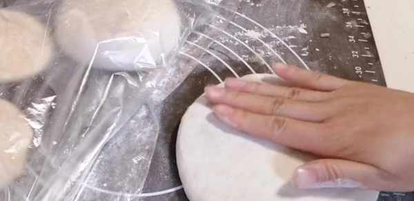 5、將面團劑整理成圓餅後松弛10分鐘。松弛好就搟成中間厚,邊上薄的餅皮。再次松弛10~15分鐘,松弛好後,就可以開始包餡料,在開始包之前一定要將面皮上多塗些粉,避免粘手。