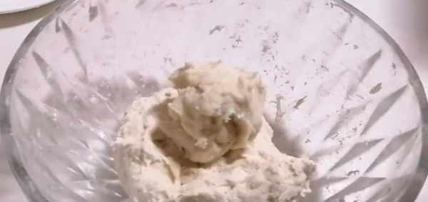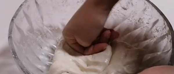 3、這個時候面團揉起來會稍微粘手,可以在揉拌的時候摔一下,摔上一兩分鐘,它就不會粘手瞭。揉好後蓋上保鮮膜,餳面15分鐘。面團餳發好後,手上抹點油,再來揣面兩分鐘,也就是手捏成團按壓在面團上。