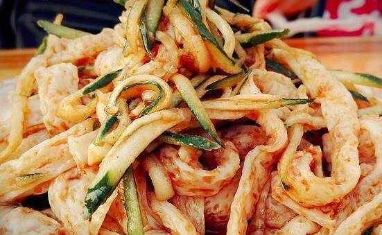 制作牛筋面的時候,首先需要選擇出上好的面粉。在其中加水之後和成較硬的面團。在其中是不能加任何添加劑的,醒好中之後就可以開始壓制。制作成條狀就可以瞭。然後開始發泡的工作,我們需要把制作好的牛筋面放到水中,浸泡2到10分鐘之後,柔軟有筋的程度就可以瞭。然後需要控掉牛筋面中多餘的水分。這時候就可以開始調制的工作,需要我們把辣椒油,醋,芝麻醬,黃瓜,鹽和雞精一起放入容器中,攪拌均勻就可以吃瞭。