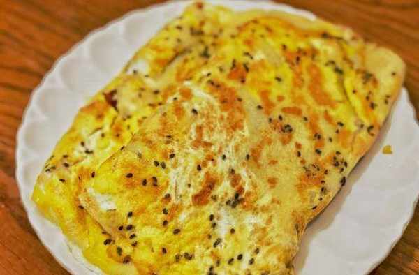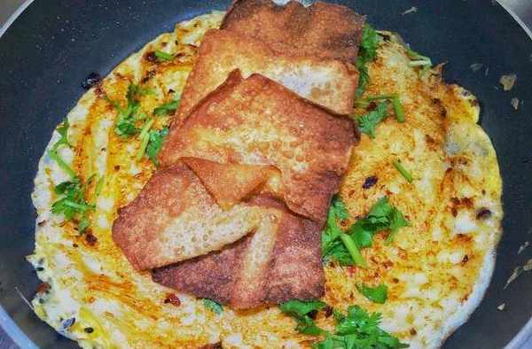 用木頭鏟子把雞蛋慢慢攤勻,讓雞蛋均勻地鋪在面餅上。