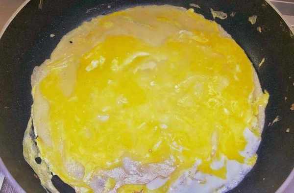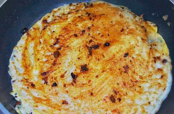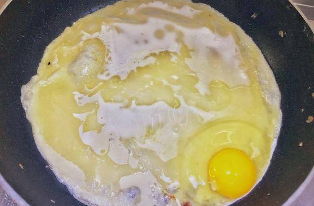 平底鍋中放入適量的油,小火加熱,面糊倒進去,差不多定型的時候,加上一個雞蛋。
