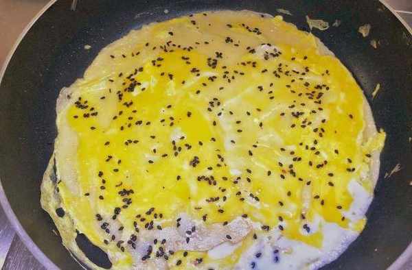 雞蛋差不多定型的時候撒上少許的黑芝麻,增加香味。