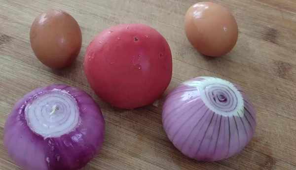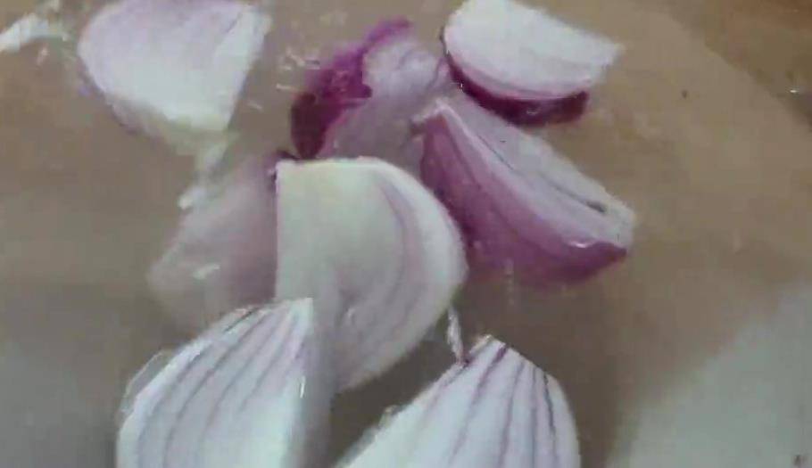 先把洋蔥簡單地從頂部切成均等的4份,然後把洋蔥放入清水中浸泡一會兒,這樣在切洋蔥絲或者是切洋蔥丁的時候,不會辣到眼睛,取出洗凈的西紅柿,用勺子將西紅柿刮一刮,這樣不用開水燙,輕輕松松就能夠去皮瞭。
