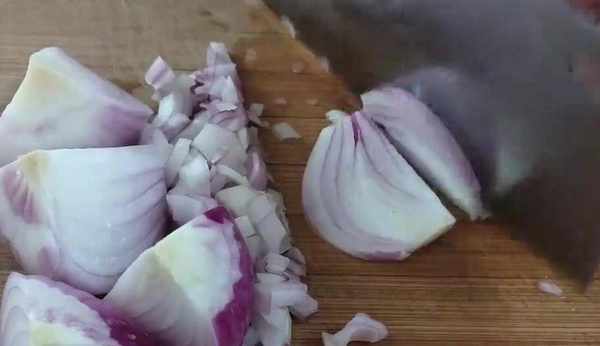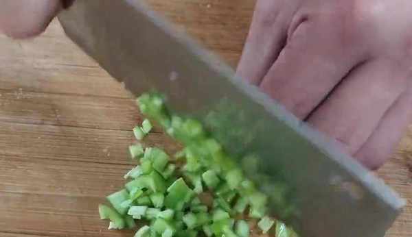 西紅柿的去皮方法方便快捷,撕下西紅柿的外皮後,將西紅柿切成西紅柿碎,取出浸泡好的洋蔥塊,先切成細細的洋蔥絲,再改刀切成洋蔥小丁,把切好的洋蔥小丁盛入一個大一點的碗裡面,準備一個青椒,一分為二,把青椒籽整理幹凈,然後切成細細的青椒絲,再改刀,切成青椒小丁,洋蔥裡面打進去兩個雞蛋,將洋蔥丁雞蛋液充分的攪拌均勻,把辣椒丁還有西紅柿丁都放進來,添加一勺食用鹽,一勺雞精,一勺胡椒粉,再次充分的攪拌均勻。