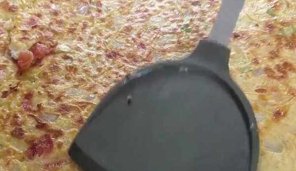 放入三大勺面粉,再放入一勺玉米面,如果說不喜歡吃玉米面的話,也可以不添加面粉也可以邊添加邊攪拌,如果面粉添加比較多的話,也可以放入一些清水,最後攪成這樣的蔬菜面糊就可以。電餅鐺刷油溫熱的時候把洋蔥丁面糊倒進去,用鏟子將面糊攤平,撒上一些黑芝麻,點綴增香,蓋上蓋子,烙三分鐘左右時間到打開蓋子就可以聞到滿滿的洋蔥香瞭,借助工具將洋蔥餅給它翻個面,翻面之後蓋上蓋子,繼續烙三分鐘左右,就可以出鍋瞭,洋蔥這樣做簡單省事又美味,我傢一周吃5次當作早餐,方便快捷。