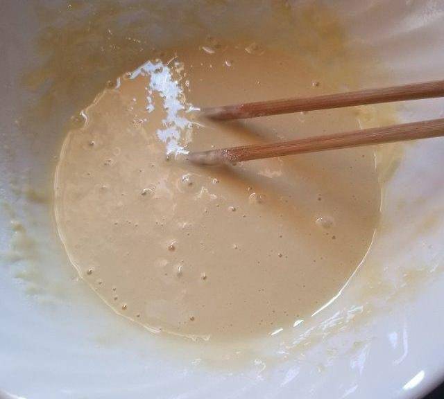 第2步、雞蛋,面粉,水,鹽和雞粉拌成稍稀的漿。(調味可以按自傢口味調。)