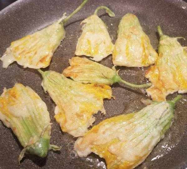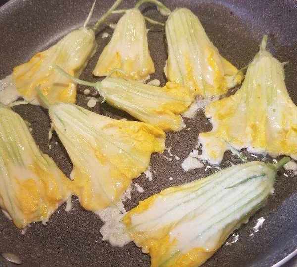 第4步、鍋放稍多一點的油,把南瓜花放入,中大火煎至有點金黃。(如果不覺得費油,也可以炸的香脆吃)