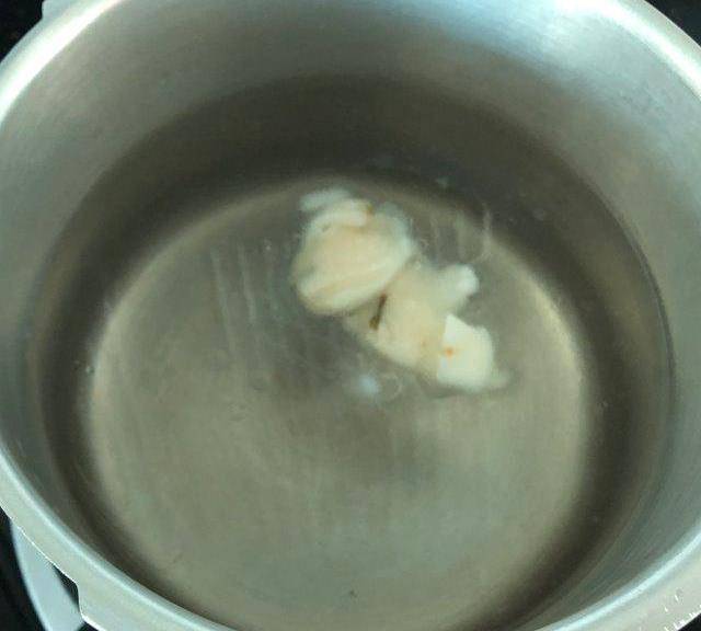 第3步、高壓鍋坐水,放入豬大骨熬出豬骨頭湯,再放一勺豬油,放入貓耳朵,上汽壓5分鐘。