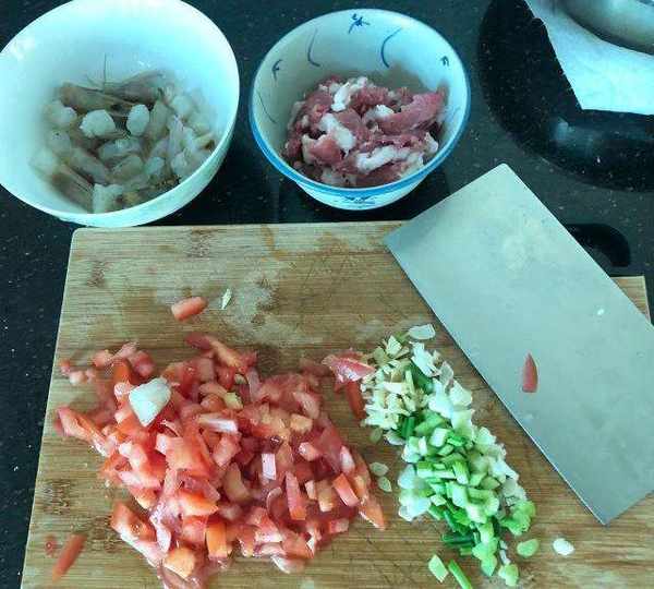 第4步、蝦去殼,蝦肉切粒,豬肉切片,西紅柿打十字花刀,用開水燙一下,去掉外衣,切小粒,蔥薑切末備用。