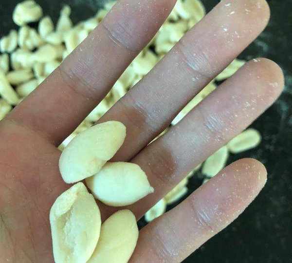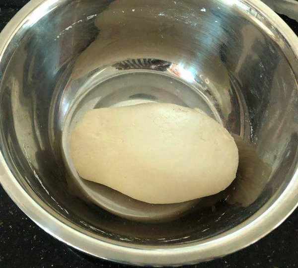 第1步、盆中倒入一碗面粉,用筷子邊攪拌邊加入冷水和勻,和成硬一點的面團,蓋上醒半個小時,將醒好的面團在案板上揉幾遍,用搟面杖搟成1厘米厚的圓餅狀,用到切成指甲蓋大小。