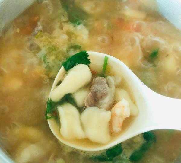 原料:高筋面粉、西紅柿、肉片、蝦、豬骨頭、香菜段、蔥末、薑末、豬油。