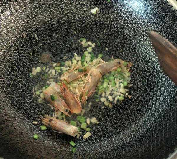第5步、鍋中倒適量食用油,放入蔥薑,蝦頭炒出紅油。