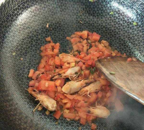 第6步、放入西紅柿,炒軟,挑出蝦頭,放入蝦肉,肉片,炒香,倒入面湯,調入適量鹽,雞精,煮沸倒入高壓鍋裡。