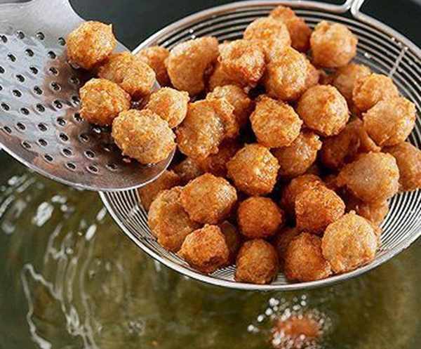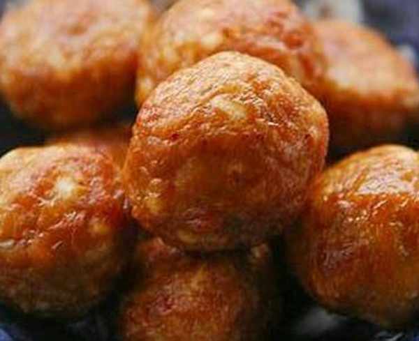 第三步,將一塊桃酥搗碎放入肉餡中攪拌均勻,接著往鍋中倒入足夠的食用油,等油溫達到5-6成熱後,用手將肉餡擠出圓球狀放入油鍋中炸制,等表面炸到微黃後撈出控油,之後將油溫再次燒熱放入肉丸子復炸,最後等表面金黃後撈出胡可。