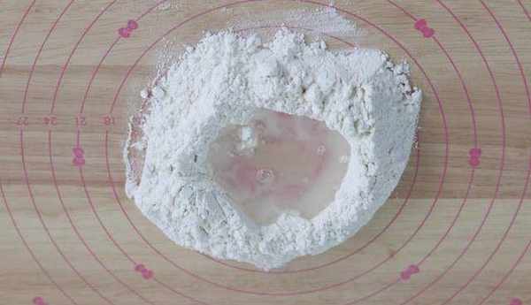 1中筋面粉放在案板上,中間挖個窩窩,倒入清水。
