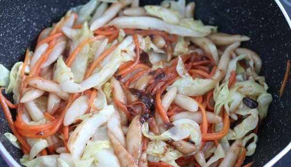 6鍋裡放適量的油,加入包菜絲和胡蘿卜絲,快速翻炒幾下。