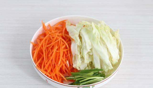 5包菜和胡蘿卜切絲,小蔥切段。