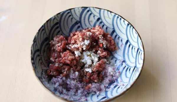 3.加瞭鹽的洋蔥擠幹水分,和牛肉肉末混合,加入淀粉、橄欖油,混合拌勻。
