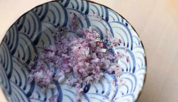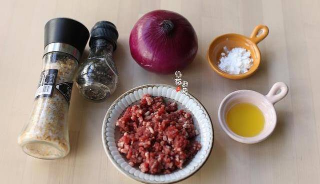 2.洋蔥切成碎末,加適量食鹽調味,把洋蔥加鹽一次加足,後面的牛肉餡兒就不要加鹽瞭,因為洋蔥吸收瞭鹽分,避免食鹽直接接觸牛肉,這樣的牛肉餅口感才不會柴。