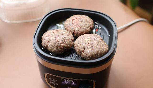7.牛肉餅做好後,如果是第二天早餐食用,放冷藏即可。把牛肉餅用不粘平底鍋小火加熱,我用的這款是東菱空氣炸鍋,之前也和大傢介紹過,這款空氣炸鍋不僅可以炸雞翅炸薯條,另外還配備瞭一個煎鍋和一個深鍋,比以前的單一的空氣炸鍋功能又多瞭不少選擇。除瞭炸,還可以用這個煎盤替代平底鍋,加熱後直接把做好的牛肉餅放在上面,選擇180度,8-10分鐘左右(視牛肉餅的大小和厚度調整時間)。