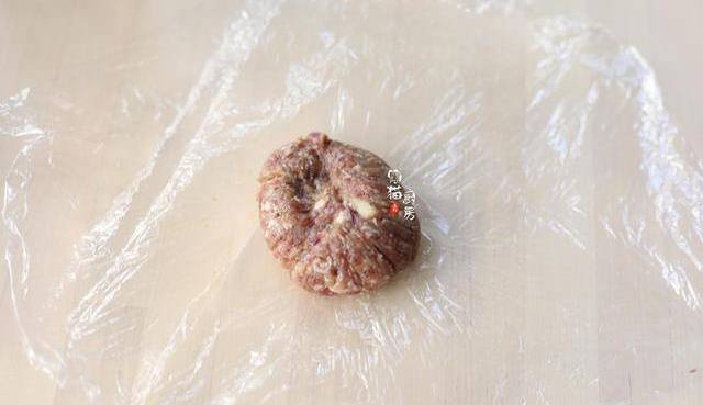 4.準備一張保鮮膜,取適量牛肉肉餡兒放在中間,包緊後容易把肉餡揉成圓形的肉餅形狀。