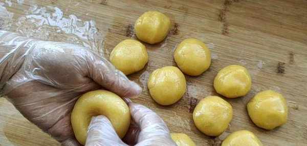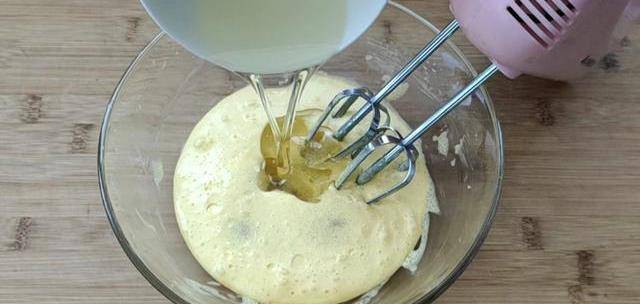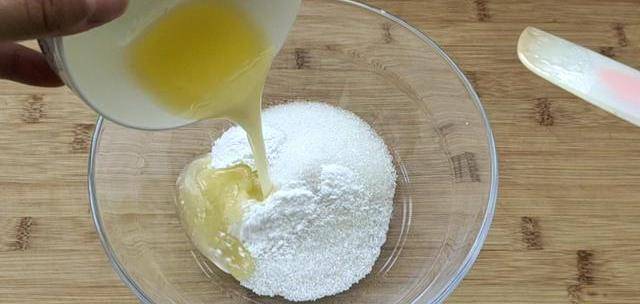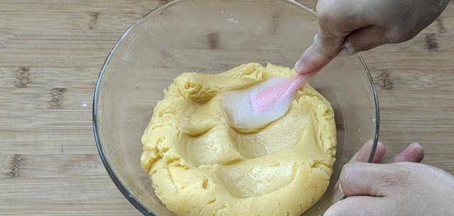 ②盆裡再加入玉米油,用打蛋器繼續攪打一分鐘,充分乳化。然後加入面粉。面粉用中筋低筋都行。攪拌均勻,最後是中等軟硬狀態的面團。稍微揉一會兒,揉到光滑。