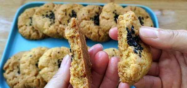 ④烤箱提前預熱,上管180度,下管160度,烤30分鐘左右。烤至兩面金黃,取出來晾冷以後,就非常酥瞭。我隻嘗瞭小半塊,被我傢小姑娘一會兒就吃完瞭。好有成就感!