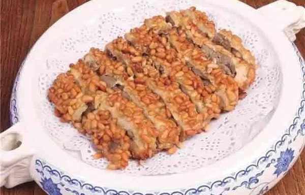 是一道傳統地方特色菜,利用羊肉和雞肉各自的鮮香,通過浸炸互相融合,再摻入松仁的香氣,趁熱食用,口感、香味無敵。改良之處在於雞肉泥中加瞭點小蘇打,這樣雞肉的口感不“發死”,而是略帶松軟,非常可口。
