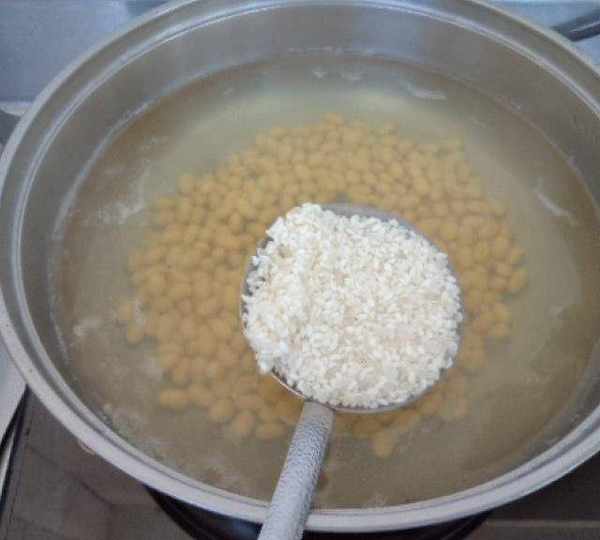 第5步、黃豆煮10分鐘後糯米、大米入鍋同煮,其間要適時攪動。