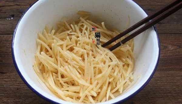 5.拌勻後的土豆絲,因為有雞蛋和淀粉,充分拌勻,使每一根土豆絲都沾上蛋液和淀粉。