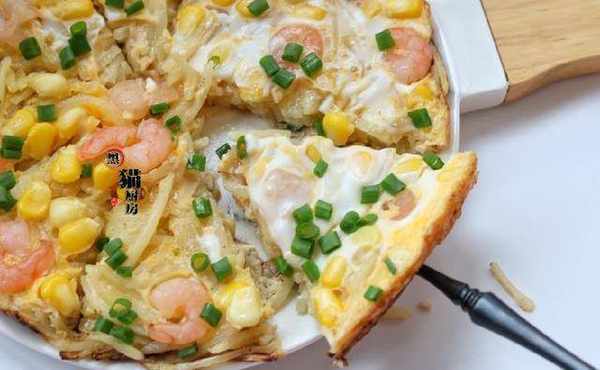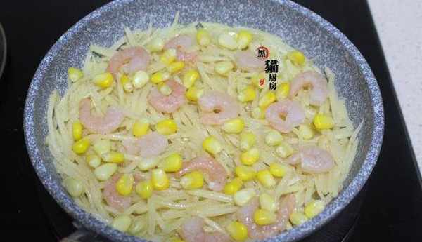 8.然後把汆燙熟的蝦仁和玉米粒鋪在土豆絲上,蓋上鍋蓋,小火烙3分鐘作用。