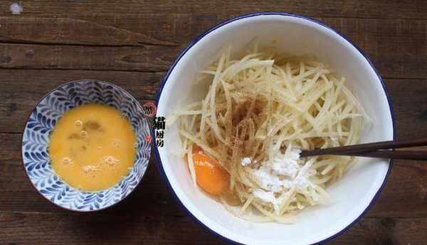 4.瀝幹水的土豆絲加入一個雞蛋,鹽、少許油和一小勺淀粉、孜然粉,另外一個雞蛋磕入碗裡,拌勻瞭一會還要用上。