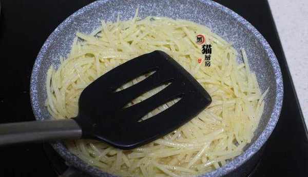7.加熱後把拌勻的土豆絲倒入不年國內,用鏟子把土豆絲鋪滿鍋底並且輕輕壓平。