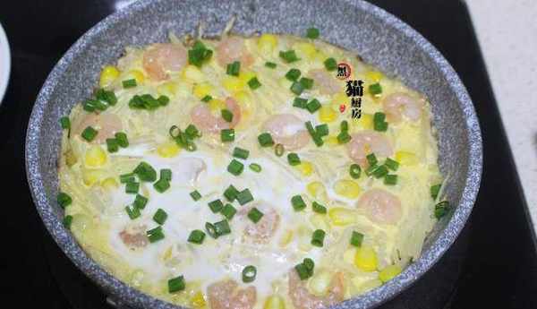 小貼士:蝦仁和玉米提前汆燙。蔥花也可以換成翠綠的西蘭花或者其他蔬菜點綴。如果對海鮮過敏,可以用培根或者火腿腸切成小圓片替代蝦仁。