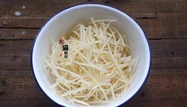 做法:1.今天做的這道早餐餅,材料是土豆,先用刨刀把土豆皮削去,然後用工具把土豆擦成絲,浸泡在清水裡,防止土豆氧化變色,而且能去除掉一些淀粉,土豆是很好的淀粉類食物,如果在減肥的朋友需要把土豆絲多浸泡過濾幾遍,去掉更多的淀粉。