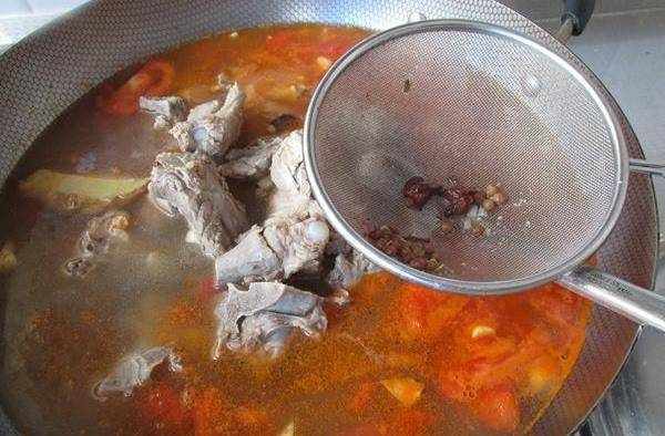 12.倒入排骨及燉排骨的湯。同時把殘留的煮肉料再度過濾出來