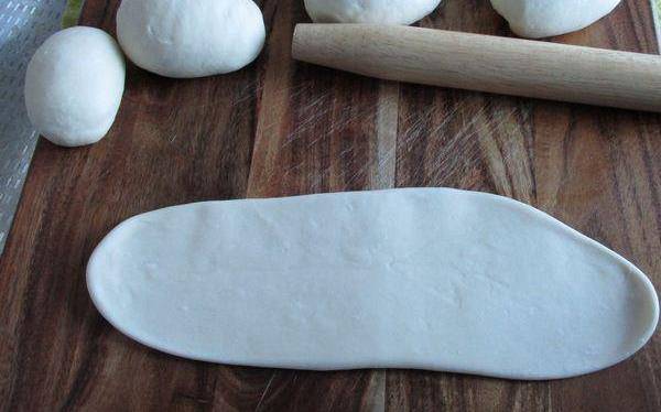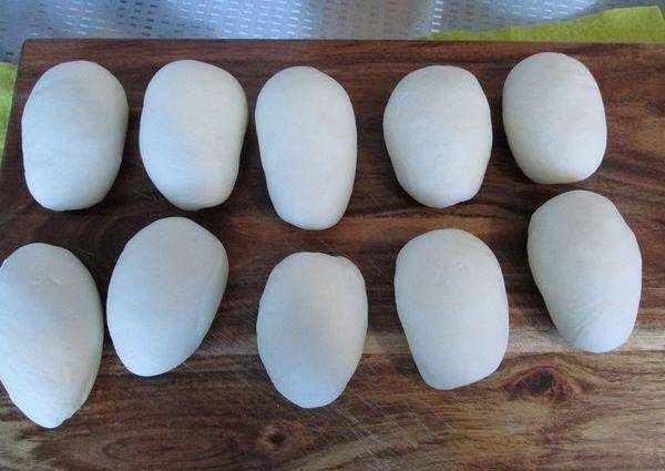 1.面粉中加3克鹽和150克水和成面團,餳半小時左右後分成10個劑子,再餳15分鐘左右