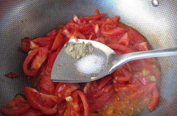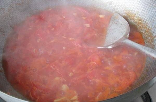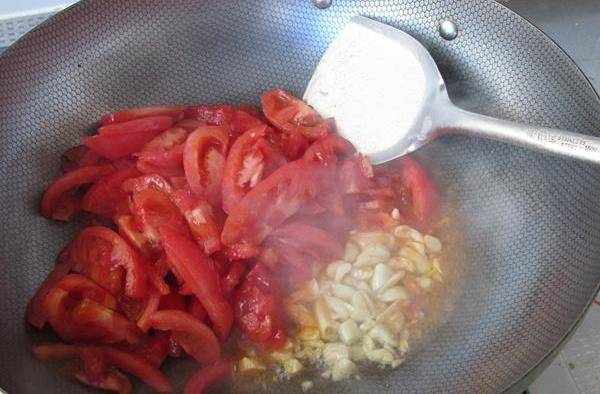 9.鍋中放油,炒香蒜末後放入西紅柿