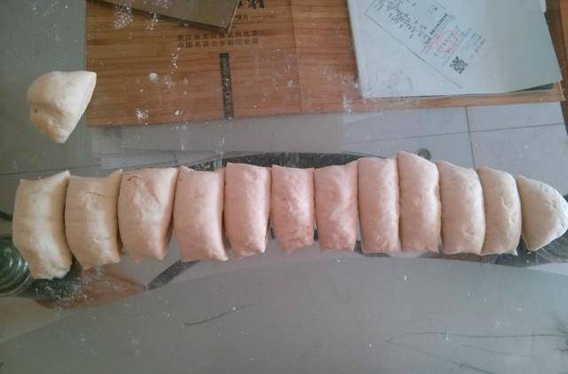2.取出面團,揉圓。整理成條狀,用刮刀切成一個個差不多大小的劑子。