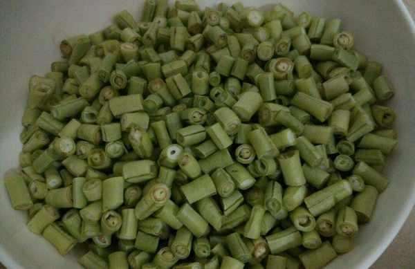 (4)用手揉搓,使每根豆角都沾上鹽粒,輕搓至豆角表面稍有點濕潤就行,放置一小時。