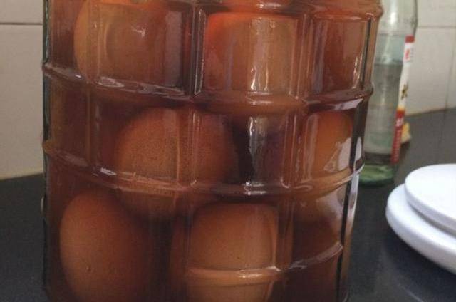 第四步:關火之後,將花椒鹽水放涼加入半杯的白酒,再將鹽水倒入到裝有雞蛋的容器當中,再將料包放進去。
