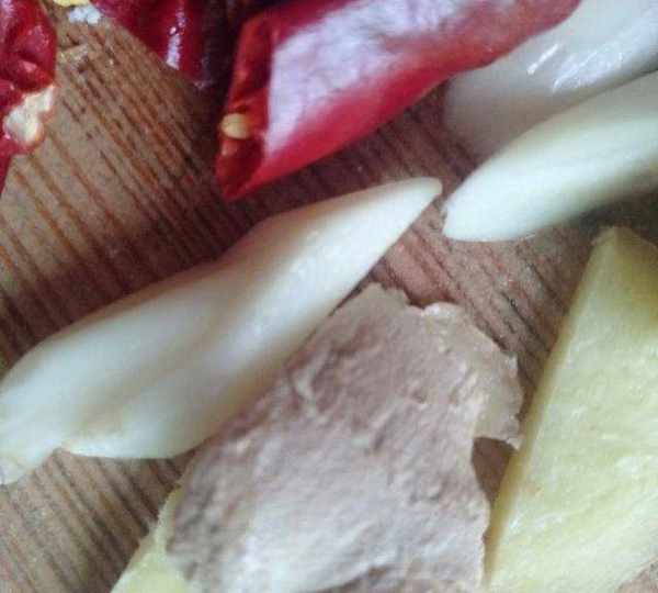 第7步、熱鍋冷油油溫五成熱時。放蒜,薑,幹辣椒炒香。