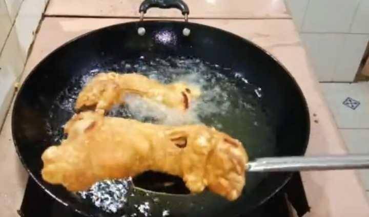 5起鍋燒油、油溫插筷子會起油泡就可以,下豬腳炸至金黃