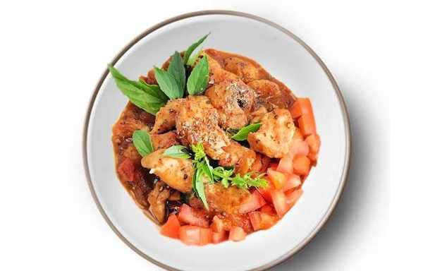 雞胸肉、番茄、九層塔、洋蔥、蒜片、薑絲、料酒、白糖、黃油