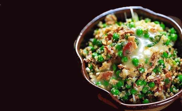 藜麥、綠豌豆、羊乳酪、培根、羅勒、香菜葉、杏仁、檸檬汁、橄欖油、鹽、蜂蜜